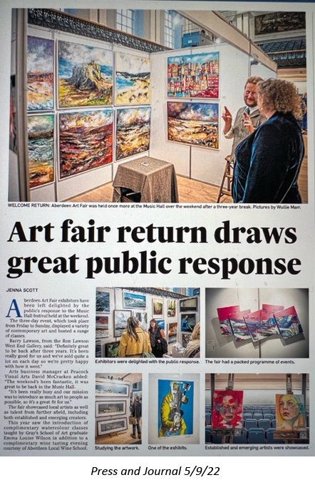 ‘Peacock have attended every Aberdeen Art Fair since the inaugural event at the Music Hall in 2010. Peacock, as a public arts organisation, have built longevity on cultivating partnerships are indebted to those events. They consistently provide an exceptional platform to sell contemporary art. We are afforded the opportunity of building new friendships and customers during and after each fair, this year was no exception. We look forward to attending the event again in Aberdeen in 2024.’ – David McCracken Arts Business Manager Peacock Visual Arts